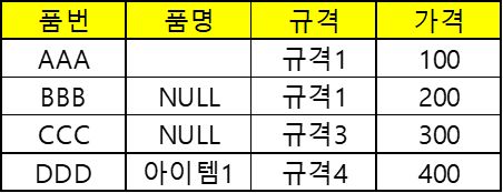 [MS SQL]ISNULL을 활용한 공란(공백)과 NULL 필드 찾기 DB 테이블의 데이터 중에 특정필드에 NULL과 공란이 공존할때에 해당 값의 레코드를 찾을 수 있는 ISNULL의 사용법 예시) 테이블명 : MASTER MASTER란 테이블에 품번, 품명, 규격, 가격이란 필드가 존재하며 아래와 같이 데이터가 있다고 가정. 이 중에 품명의 정보가 누락된 공란과 NULL인 '품번'들을 찾을 때에 ISNULL을 활용하면 된다. SQL : SELECT 품번 FROM MASTER WHERE ISNULL(품명,'') = '' 설명 : MASTER란 테이블에서 품명의 필드값이 공란인 품번을 갖고 와라~ 하지만 여기서 품명필드가 NULL이면! 공란으로 변경하여 비교를 하니 NULL과 공란 모두의 품번을 갖고 옴. 추가설명 : ISNULL(필드명, 대체자) => 필드명이 NULL이면.. SQL/MS SQL 2022.10.20